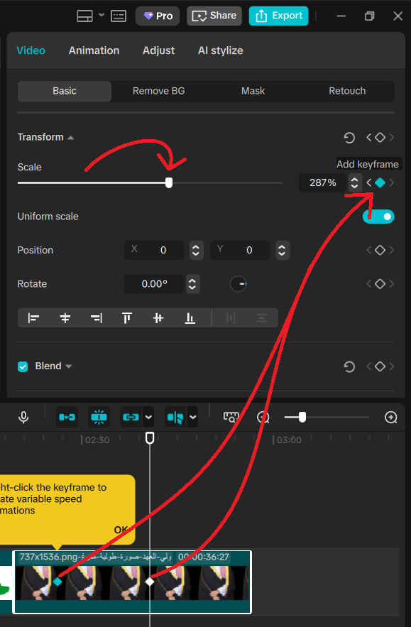 فقط ضع مؤشر مساحة العمل على موقع البداية – ثم اذهل الى مكان التعديل ,واضف Keyframe