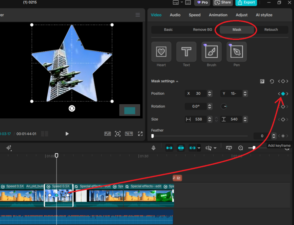 اختر القناع حدد موقع البداية ثم فعل مفتاح الفريم واذهب الى مكان نهاية الحركة وحركه