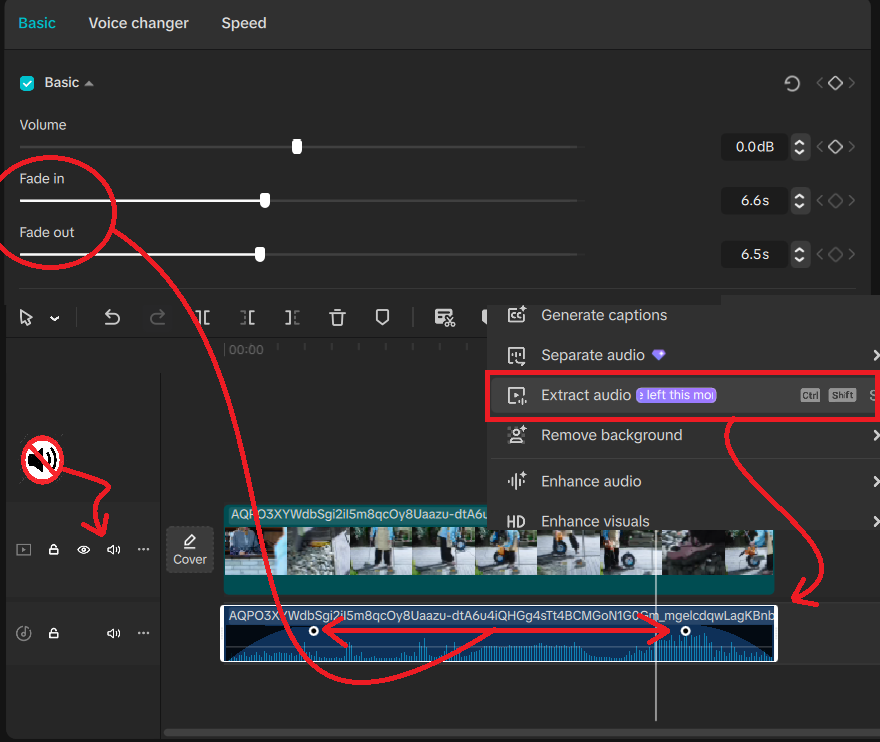 بعد استخراج الصوت يمكنك التحكم به ومن الخيارات الجميلة هي تلاشي الصوت