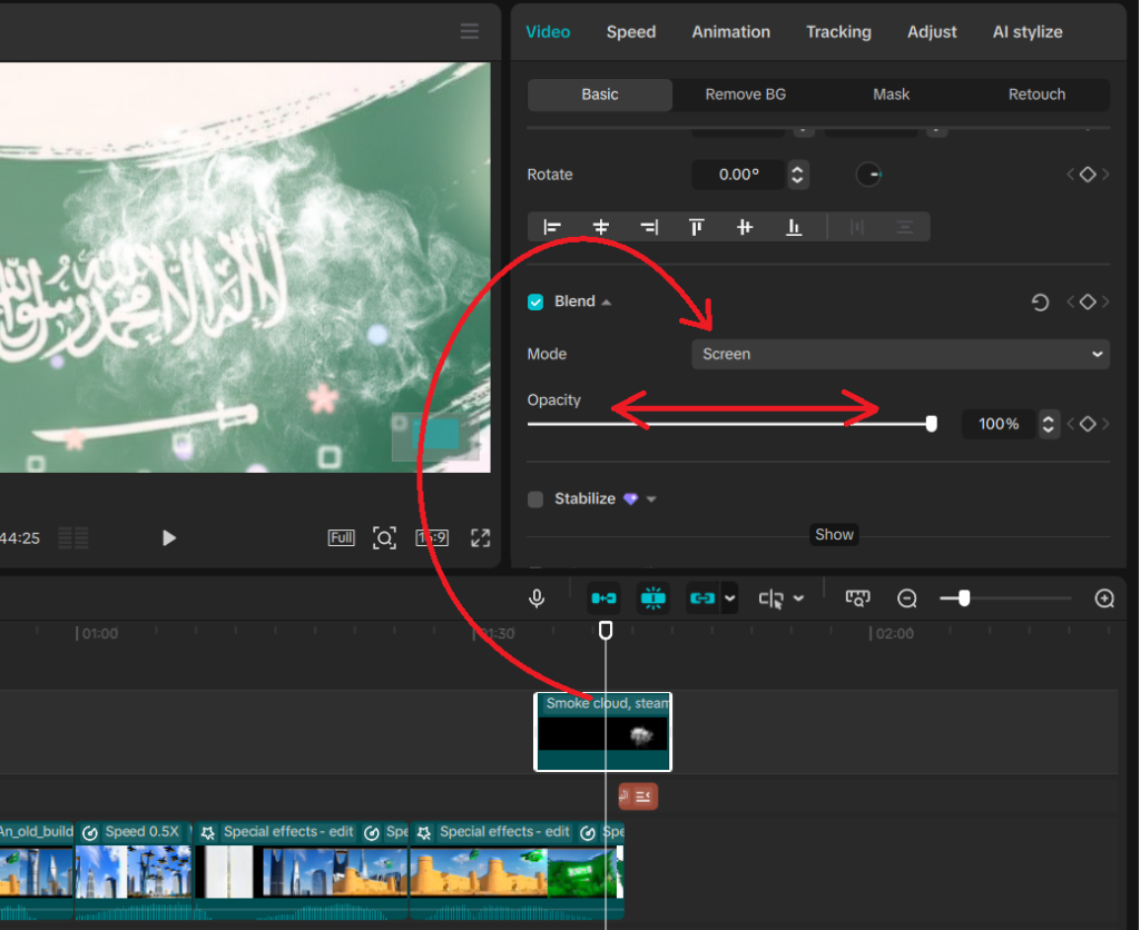 بعد اضافة التاثير حدده ومن قائمة Blend جرب الخيارات في الشريط حتى تصل ال خيار مناسب
