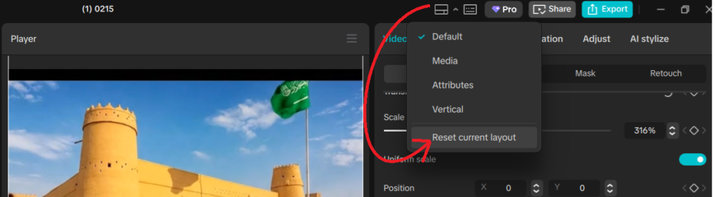 ولو اردت التحكم في التحجيم سواء الطول او العرض ازر علامة التفعيل اسفل منه - Uniform scale دوران اتجاه الفديو